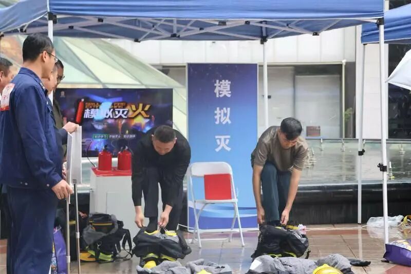 活动现场,参赛选手们展开了激烈比拼。模拟灭火项目要求选手们在穿戴上消防服后,在电子模拟设备上根据不同火灾场景选择正确灭火器灭火,既比拼消防服穿戴熟练度,又比拼消防知识储备。
