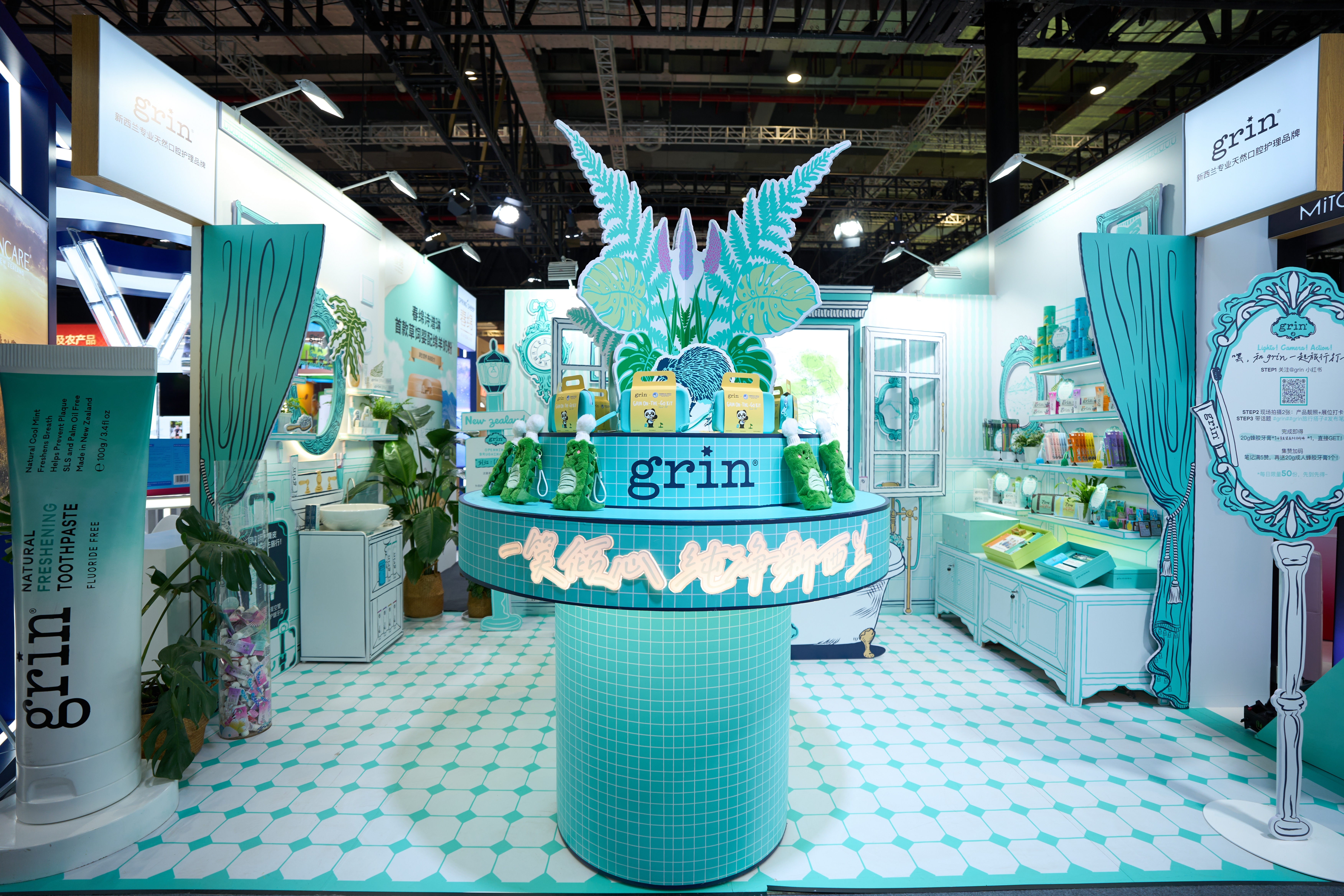 本届进博会上,grin的展台坐落于8.1号馆农食展区B4-03 F10,与新西兰国家馆联合呈现,以“一笑倾心,纯净新西兰”为设计理念,打造出沉浸式“新西兰漫游互动空间”。模拟旅行打卡场景让观众仿佛置身南半球净土,“刷牙吧”体验区则吸引了众多市民驻足,亲身体验grin全系列口腔护理产品的纯净品质。