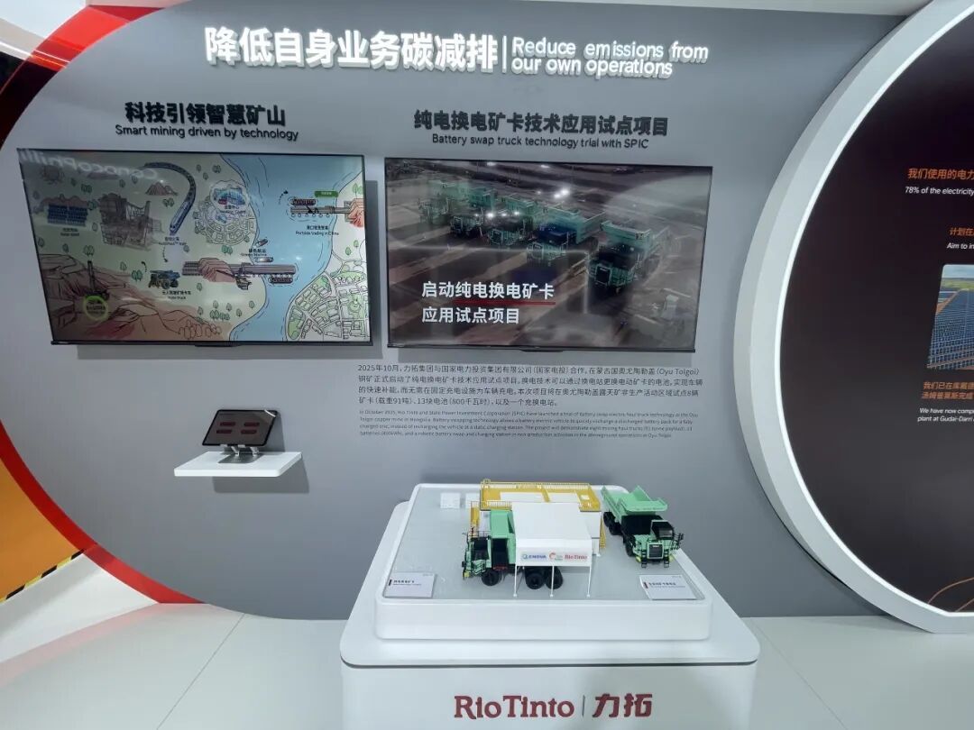 此外,力拓还现场展示了与国家电力投资集团有限公司(国家电投)在蒙古国奥尤陶勒盖(Oyu Tolgoi)铜金矿联合开展的纯电换电矿卡技术应用试点。