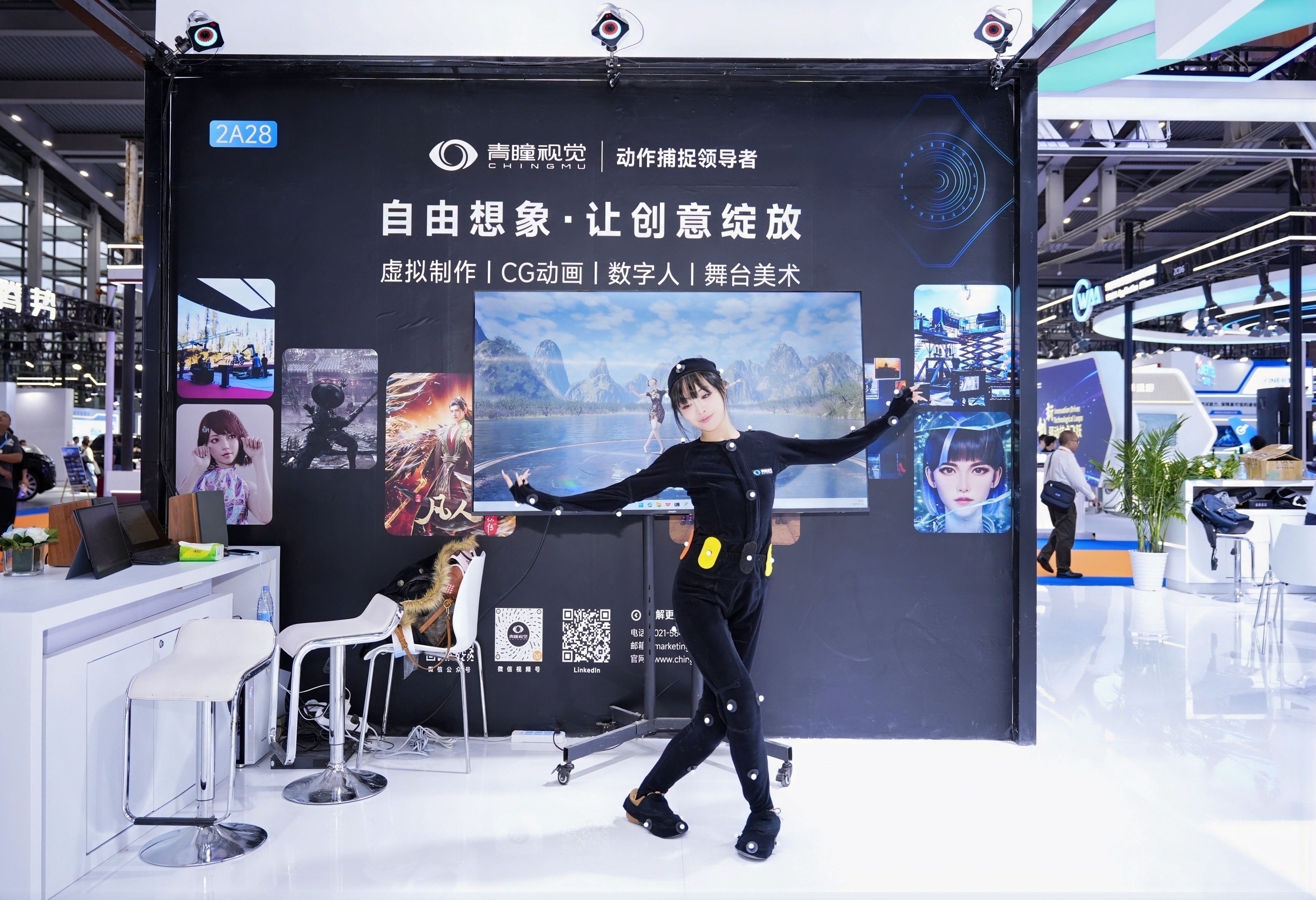 上海青瞳视觉科技有限公司带来了目前市面上最为精准的红外光学动作捕捉技术。展区内,身着特制服装的舞者翩翩起舞,服装上精准分布的53个反光标记点随着舞姿灵动变化,屏幕上的数字人完全同步复现着舞者的每一个动作。这项技术以其高精度、低延迟和优异的实时性为主要特点,能够精细捕捉五个指尖的微妙运动轨迹,将动作制作效率提升数倍,适用于对数据准确性要求高的科研、医疗、动画制作等领域。