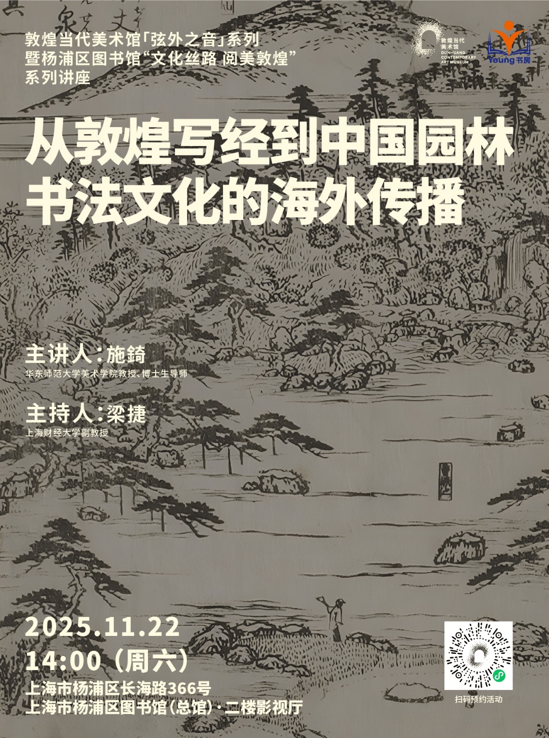 由华东师范大学美术学院教授施錡主讲,上海财经大学副教授梁捷主持。讲座将从敦煌写经与园林碑刻出发,追溯书法在中日文化交流中的传播脉络,探讨笔墨如何在山水与庭园间延展出新的精神空间。在文字与景观的交织中,聆听园林间流动的“弦外之音”。