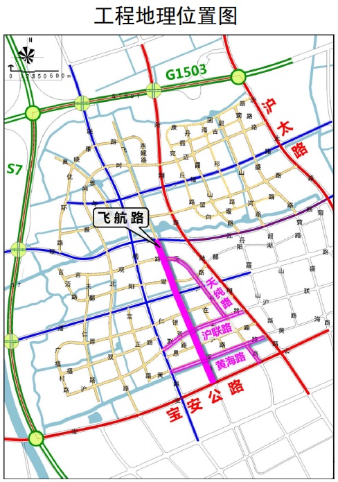 宝山顾村大型居住社区拓展基地飞航路(瑞丽江路-宝安公路)道路新建工程,北起瑞丽江路,南至宝安公路,路线全长约1574.01米,红线宽度20米。飞航路为南北走向,沿线跨越周家浜和孟泗泾两条河道,需新建两座桥梁。本次建设内容主要包括道路、桥梁、雨污水、驳岸、照明、绿化以及相关附属工程等。