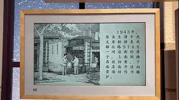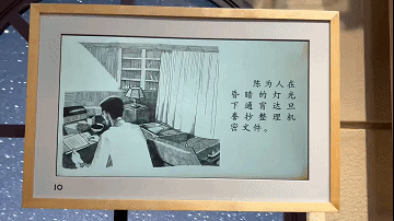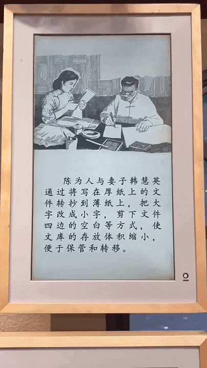 如果说音乐剧是用声音唤醒记忆,那么 AI 动态手绘则为历史注入了灵动的视觉生命力。为了更生动地呈现中央文库的守护故事,展览特别邀请青年画家葛冬冬执笔,以细腻的笔触勾勒出陈为人夫妇、陈来生等守护者的群像。画作不仅精准还原了先辈们的神态与所处的历史场景,更通过线条传递出他们内心的坚定与赤诚。而 AI 技术的加持,让这些静态的画作完成了 “从静到动” 的蜕变:画面中,陈为人低头誊抄文件的动作缓缓展开,韩慧英整理档案的身影轻轻移动,与舞台上的剧情形成巧妙呼应。当动态画作与展柜中珍贵的原始档案同步亮相,历史场景、艺术创作与真实史料相互印证,构建起一个多维立体的观展空间,让观众仿佛置身于那段峥嵘岁月,与先辈们进行一场跨越时空的精神对话。