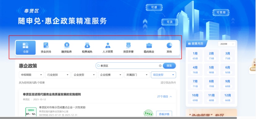 进入“奉贤区企业专属空间”→点击进入“随申兑·惠企政策精准服务平台”