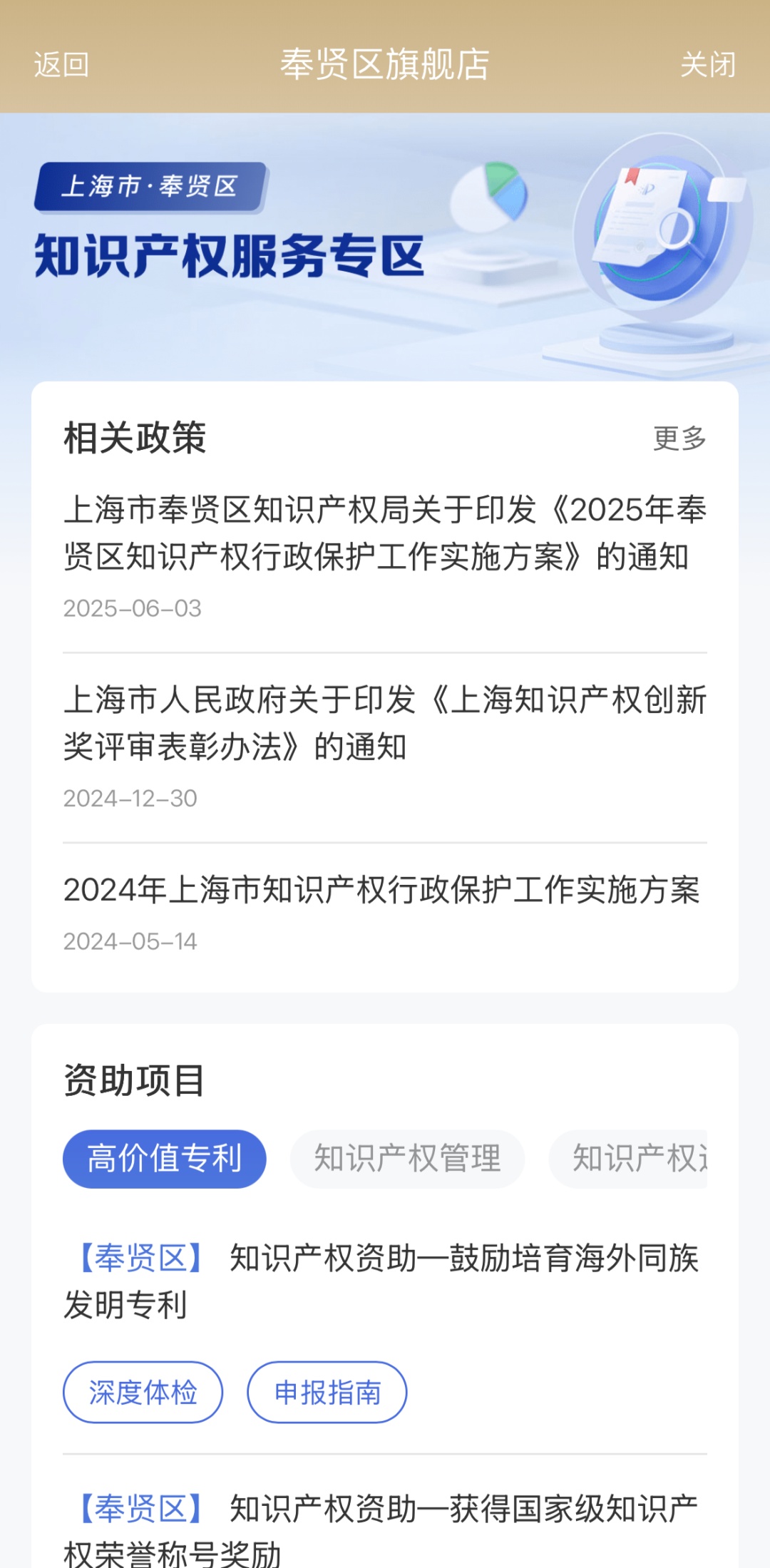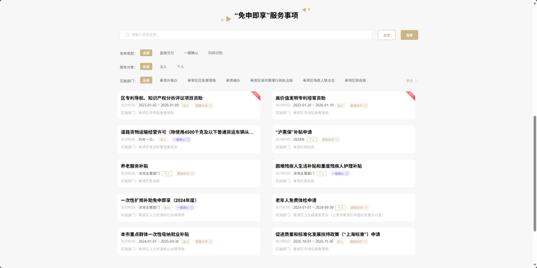 值得一提的是:“奉贤区随申兑·惠企政策精准服务平台”目前已整合31个部门371条政策,上线20类共125个事项,提供政策认领、政策图谱、政策拆解、政策画像、智能体检、政策月历等功能。平台上线全区首个“直达快享”事项——“服务业发展引导资金申报”,评审时效压缩超50%;上线全市区级层面“凭码兑付”免申即享事项——“获国家知识产权荣誉称号奖励”,兑付资金当日到账。