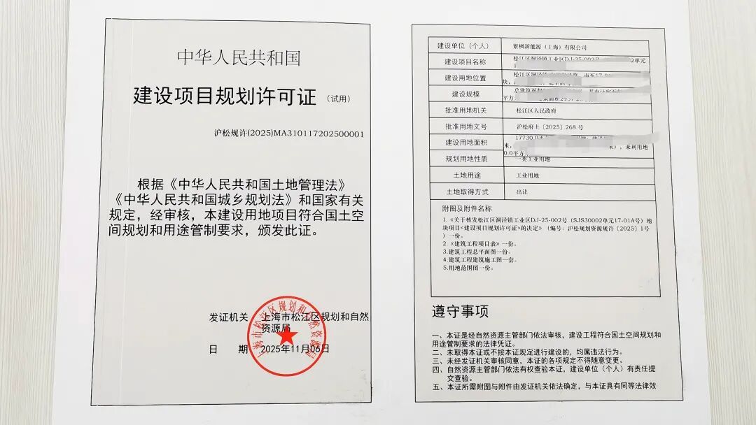 11月6日,对区规划资源局来说,是忙碌而特殊的一天。在内部科室高效协作、洞泾镇服务专员陪同帮办下,繁枫新能源在交地当天领取了土地证,并在完成建设工程设计方案批复的基础上,还拿到了一张全新的证书——建设项目规划许可证。“这是松江首个产业项目‘两证合一’的建设项目规划许可证。”区规资局规建科科长李静介绍。