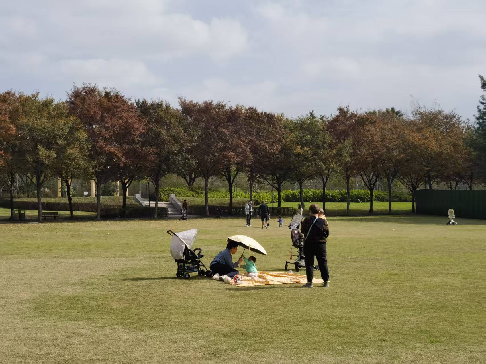 趁着阳光正好,不少市民走出家门,走进公园踏秋。他们或是铺上野餐垫席地而坐,或是推着婴儿车遛娃,与绚丽多彩的植被共同构成一道亮丽的秋日画卷。“前两天一直下雨,今天终于出太阳了,就带着宝宝到公园逛逛,大家玩得很开心。”市民苟女士告诉记者。