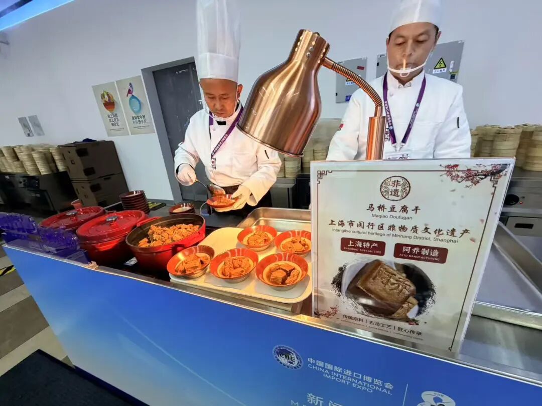 今年,在进博会新闻中心的二楼媒体餐厅,一个飘着浓郁香气的固定档口吸引了中外记者们驻足停留。 档口前,一碗碗热气腾腾的仔排炖马桥豆腐干被递到手中,中外记者们细细品味吸饱了汤汁的马桥豆腐干,赞不绝口,“This is so good!” 仔排炖马桥豆腐干——这道从闵行区众多美食中脱颖而出、全区唯一入选的特色佳肴,用一口地道的非遗美味,为奔波在报道一线的媒体人提供了暖心又暖胃的能量补给。 马桥豆腐干为何能亮相进博会? 马桥豆腐干,是上海地区最具代表性的地方传统特色豆制品之一。其制作历史可追溯至明末清初,因清香扑鼻、味美多汁的口感而长期流传于民间。