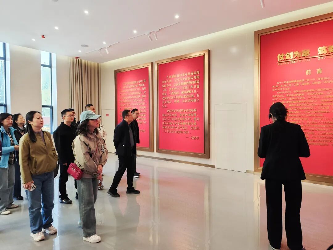下午,基地一行来到四十一团学校(粤兵中学),校长陈宁、副校长仝芸热情接待。仝芸介绍道,该校是广东教育援疆的代表性中学,其前身为新疆生产建设兵团农三师四十一团子校,2012年经全国红军小学建设工程理事会正式授牌为“第三师四十一团红军小学”,2021年11月四十一团学校被教育部办公厅认定为第三批全国中小学中华优秀传统文化(红色文化)传承学校。