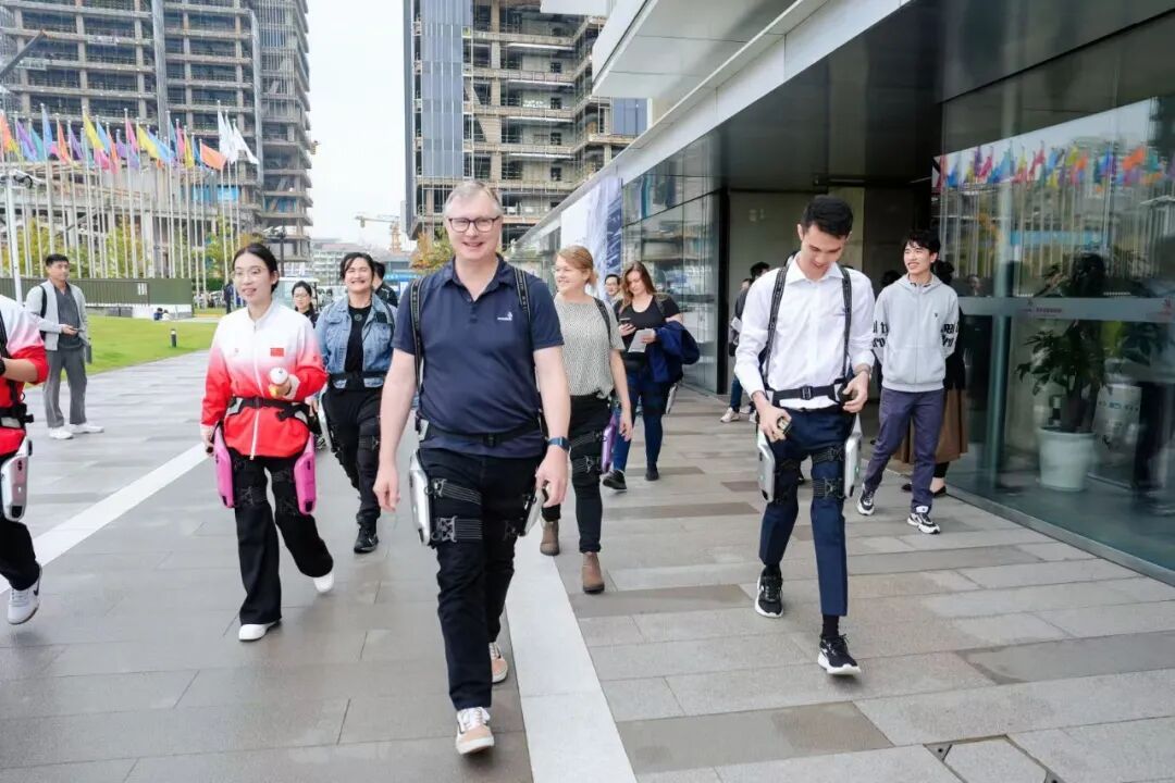 活动中,一群穿戴外骨骼机器人的“科幻先锋”格外亮眼。世界技能组织代表、世赛冠军、技能大师等人在智能装备的辅助下畅游滨江,引来不少市民驻足观看。