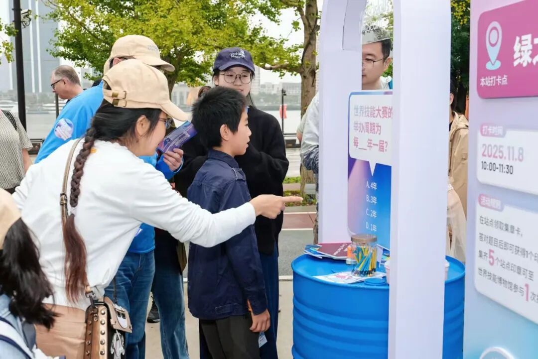 值得一提的是,为迎接2026年上海第48届世界技能大赛,活动现场还设置了多个融合世赛元素的互动打卡点。世赛吉祥物“能能”与“巧巧”同时惊喜亮相,引得市民纷纷合影留念。此外,参与者通过沿途的知识问答互动收集特色印章,还能兑换精美文创礼品,在轻松愉快的氛围中了解技能知识。