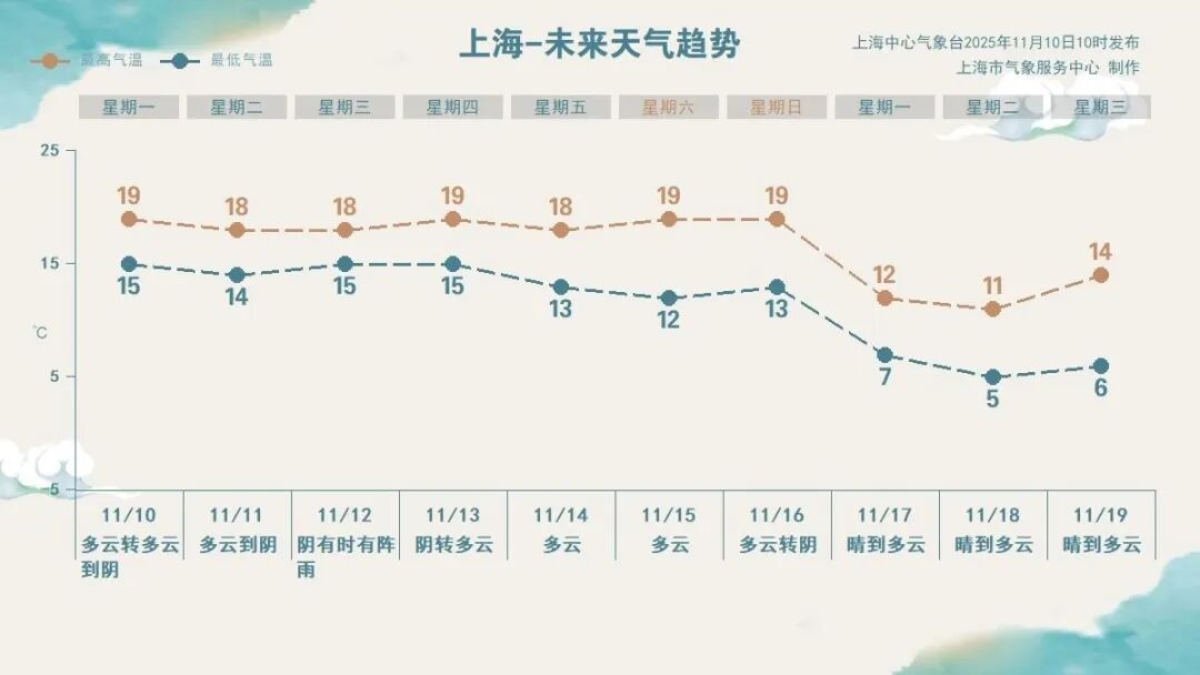 受地面高气压影响,上海今天(11月10日)白天以多云天气为主。冷空气余威犹在,因而升温幅度不大,但有阳光相伴,全天气温在15~18℃。东北风4~5级,沿江沿海阵风6级。相对湿度85%~50%,体感比较凉爽。