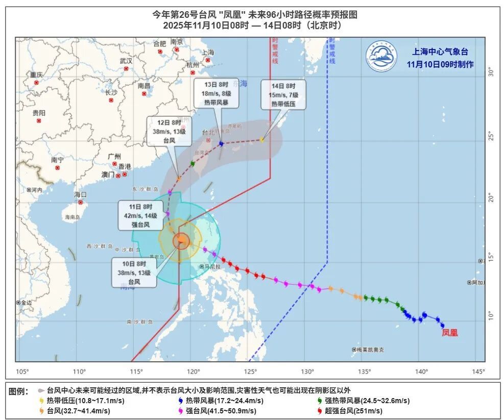 今年第26号台风“凤凰”今天08时中心位于南海,距离台湾省鹅銮鼻南偏西方向约590公里,强度为台风级。预计“凤凰”明天夜间开始逐渐转向东北方向移动,可能于12日下午到晚上在台湾岛西南部沿海登陆,之后强度快速减弱。受“凤凰”和冷空气共同影响,未来2—3天,我国东南沿海部分地区和海面有明显风雨天气。