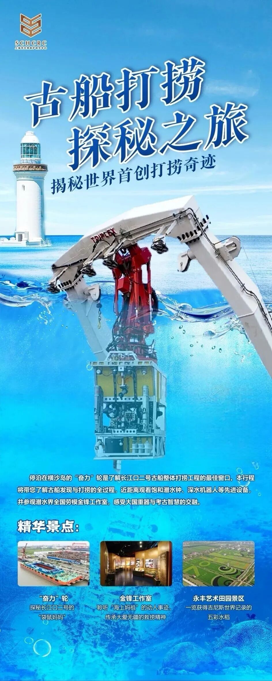晚清长江口二号古船整体打捞迁移是世界迄今为止规模最大的古船考古与文物保护项目。停泊在横沙岛的“奋力轮”是了解长江口二号古船整体打捞工程的最佳窗口。本行程将带领游客重温长江口二号古船发现与打捞全过程,并近距离观看300米饱和潜水钟、深水机器人等先进设备,参观金锋劳模工作室,感受尖端科技、大国工匠与考古智慧的交融;行程还将带游客感受海上净土横沙岛的自然风光和人文律动。