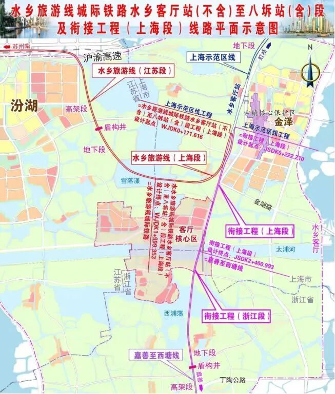 本次开工建设的衔接工程起自上海示范区线水乡客厅站,向南穿越太浦河后止于嘉善至西塘线祥符荡站站前盾构起点,全长约4.3公里,其中上海段约2.2公里、浙江段约2.1公里。为确保工程实施的一致性,衔接工程上海段由上海申铁委托嘉兴市市域铁路公司负责建设管理,开创了跨省市合作的先例。