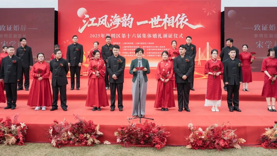 据悉,崇明区集体婚礼活动已连续举办16年。今年的婚礼在延续中式婚礼传统的同时,更注重简约与文明理念。仪式尾声,荣获“海上最美家庭”称号的家庭代表带领新人共同宣读《传承优良家风承诺书》,在誓言与掌声中,写下爱的初心与家庭的承诺。