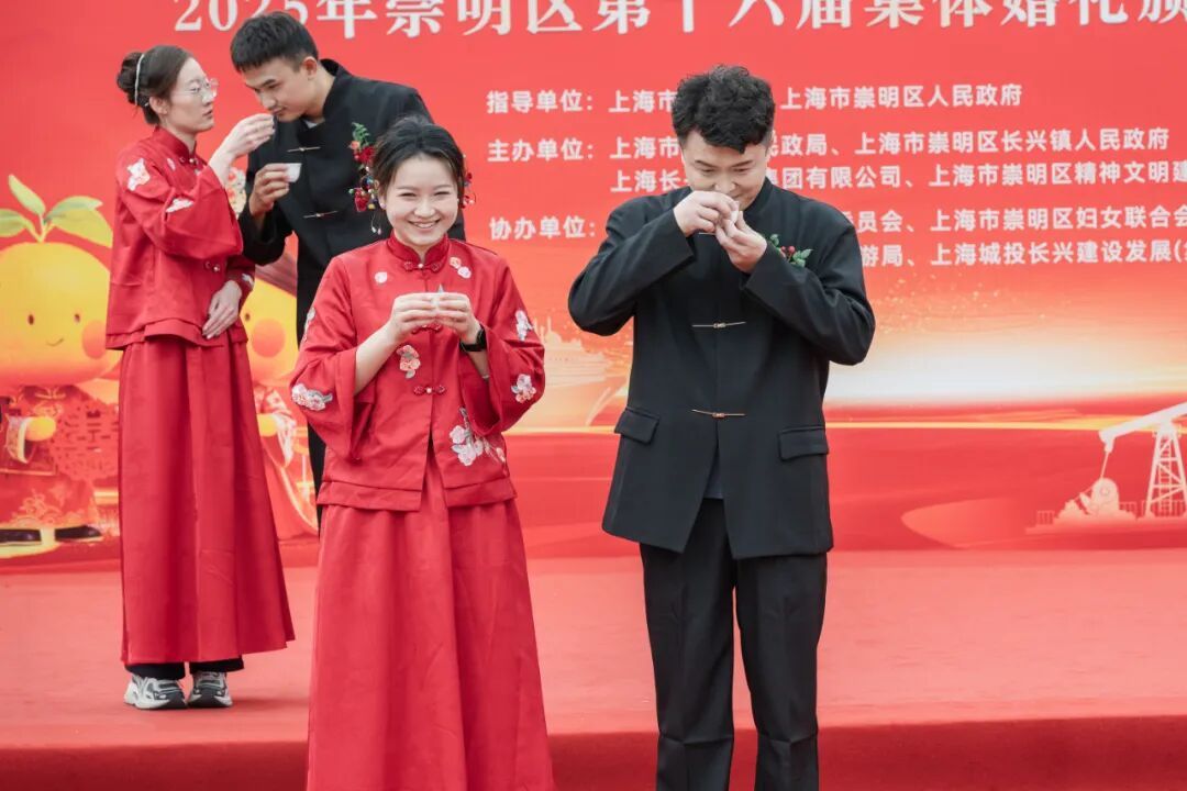 在司仪的引导下,新人们依次完成颁发婚书、交拜礼和合卺礼等环节。他们接过婚书、按下手印、举杯共饮,笑容与泪光交织,掌声与祝福声此起彼伏。婚礼特别选用了崇明本地老白酒作为交杯酒,寓意同甘共苦、携手一生。“我们特意选择集体婚礼,就是想以不铺张、不浪费的方式表达对彼此的承诺。”一对新人开心地说。
