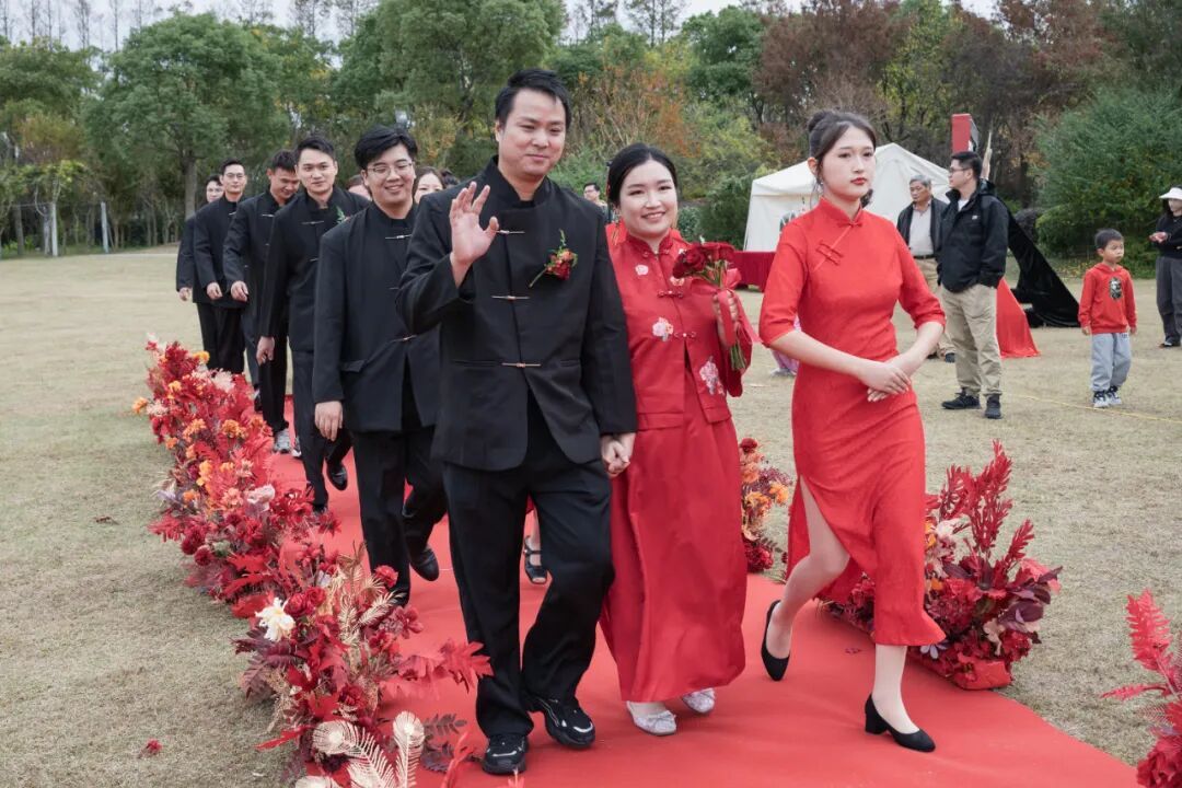 上午十点半,在悠扬的旋律中,新人们携手步入婚礼现场。新娘身着海派旗袍,新郎一袭中山装,步履相随,笑意盈盈。金色阳光洒落花海间,映出一幅独属于崇明的浪漫画卷。