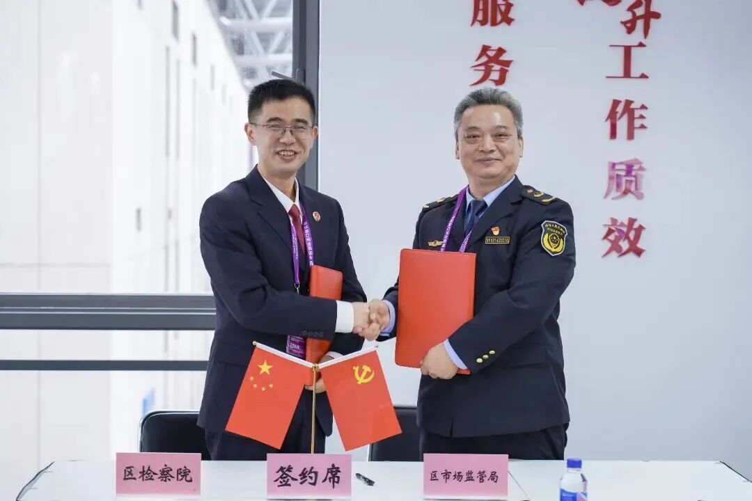 青浦区检察院与青浦区市场监管局会签《关于建立青浦区公平竞争审查与检察公益诉讼协作配合的实施意见(试行)》。意见聚焦公平竞争审查质效提升与营商环境持续优化,致力服务全国统一大市场建设,发挥法治与行政协同治理效能。双方就协作目标、重点领域、联合抽查评估等关键环节达成共识,明确后续工作推进方向。 青浦区检察院与青浦区市场监管局揭牌“青浦区公平竞争府检协作联络点”。 推进会以深化青浦区公平竞争审查与检察公益诉讼协作为主线,同步推动公平竞争政策宣传融入进博会等重大活动、提升公众公平竞争意识与风险防范能力、推动区域公平竞争审查工作提质升级。活动期间,区市场监管局介绍协作基本情况,区检察院解读实施意见。