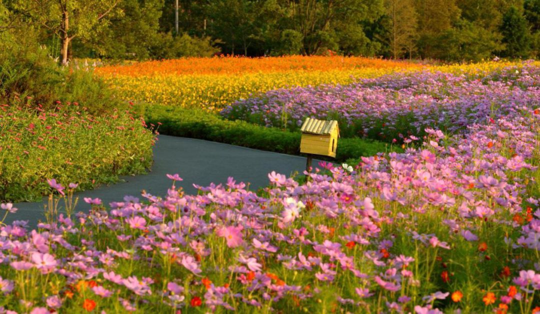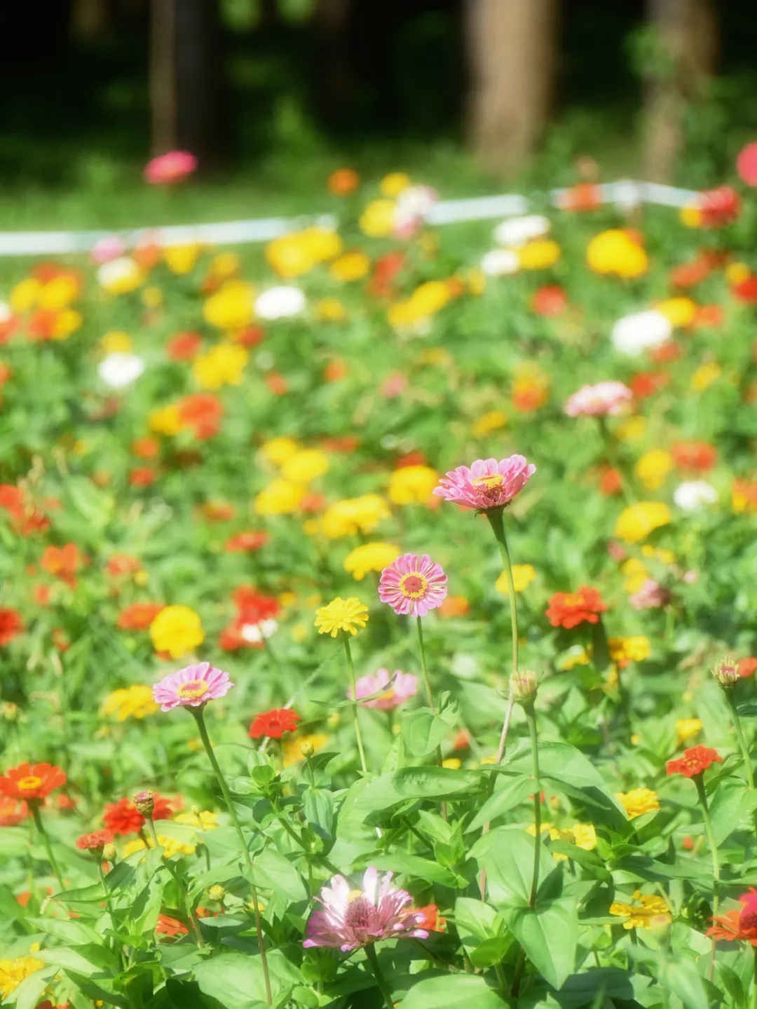 靠近公园1号门,成片的百日菊正热烈盛放。深红、明黄、亮橙、纯白、粉紫……各色花朵层层簇拥,连绵成绚烂的花浪,在阳光下交融成斑斓色块。