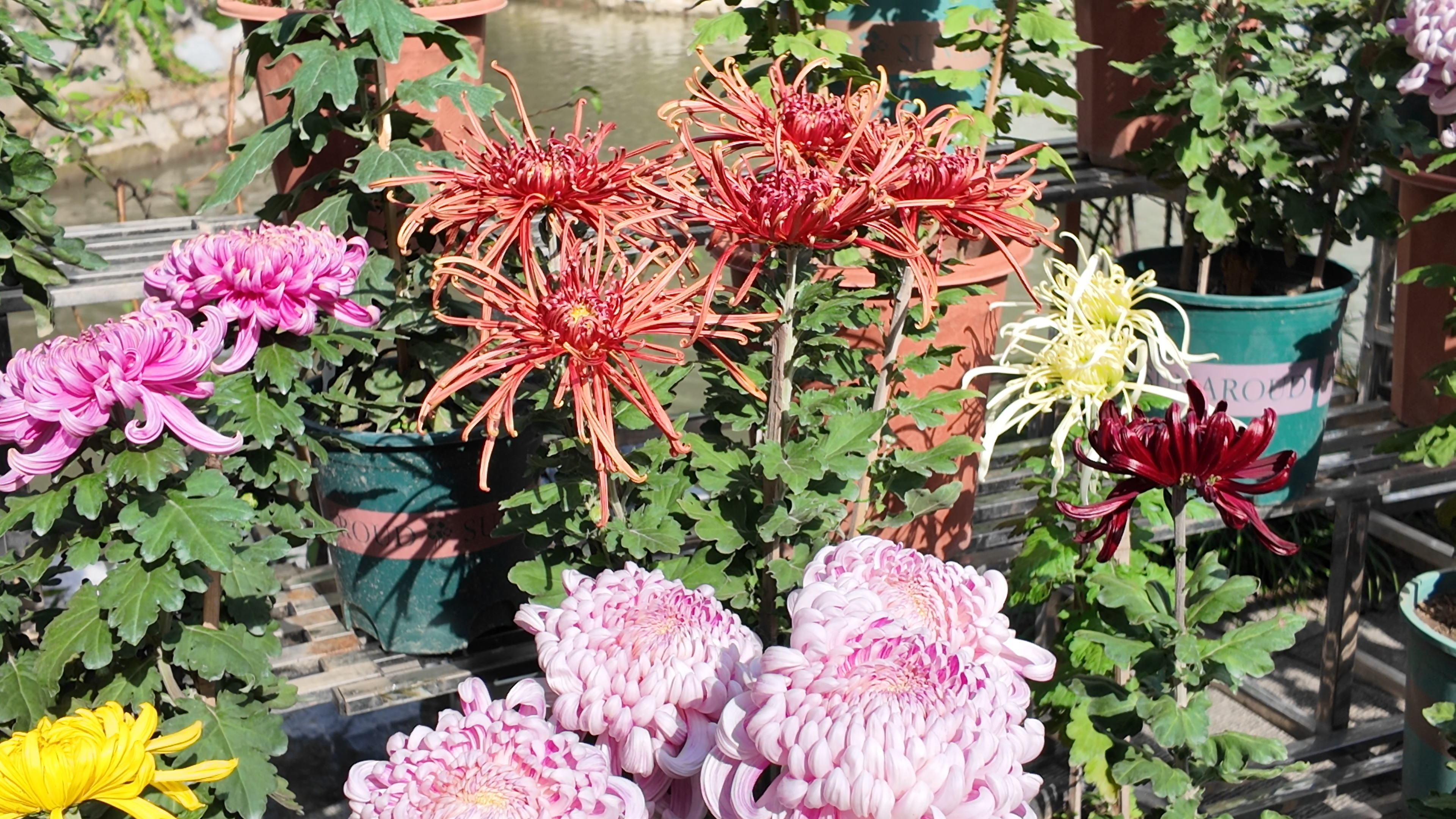 尽管今年的高温天气为菊花培育带来不小的挑战,但在赵张永的精心呵护下,各色菊花依然绽放如初,争奇斗艳。赵张永自幼在花丛中长大,祖辈的匠心早已融入血脉。为了让传统菊花更具生命力,他深耕嫁接技艺数十年,练就一手“点菊成金”的绝活。他介绍说,再过一周左右,这些菊花将进入盛放期。他每天都会来查看和浇水,如果发现状态不佳的,会及时从基地替换。2011年,在宜川路街道的支持下,赵家花园的“种植基地”在社区文化活动中心的屋顶上建立起来,这片天地不仅庇护了非遗技艺,也延续了赵张永的养菊梦想。