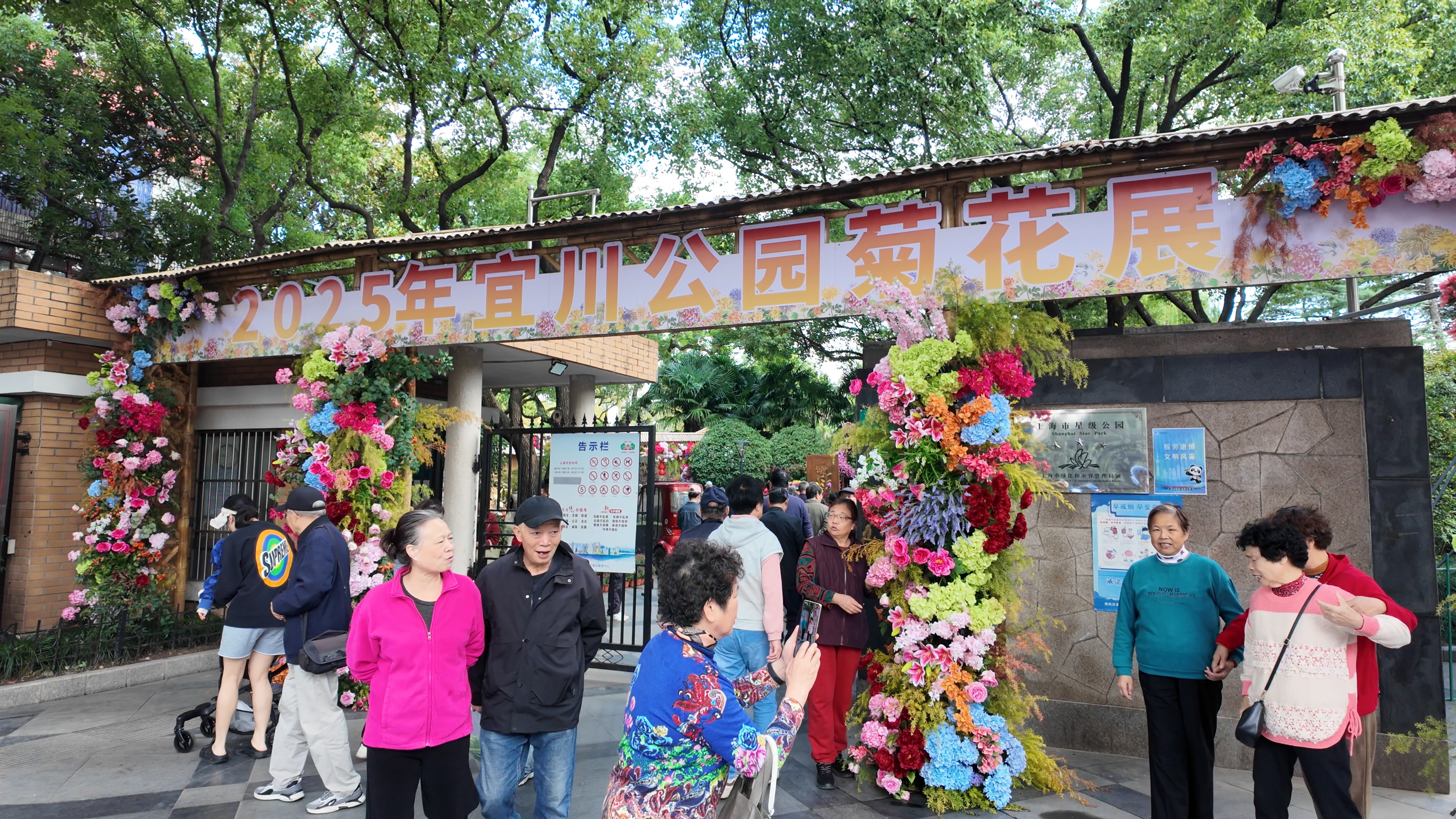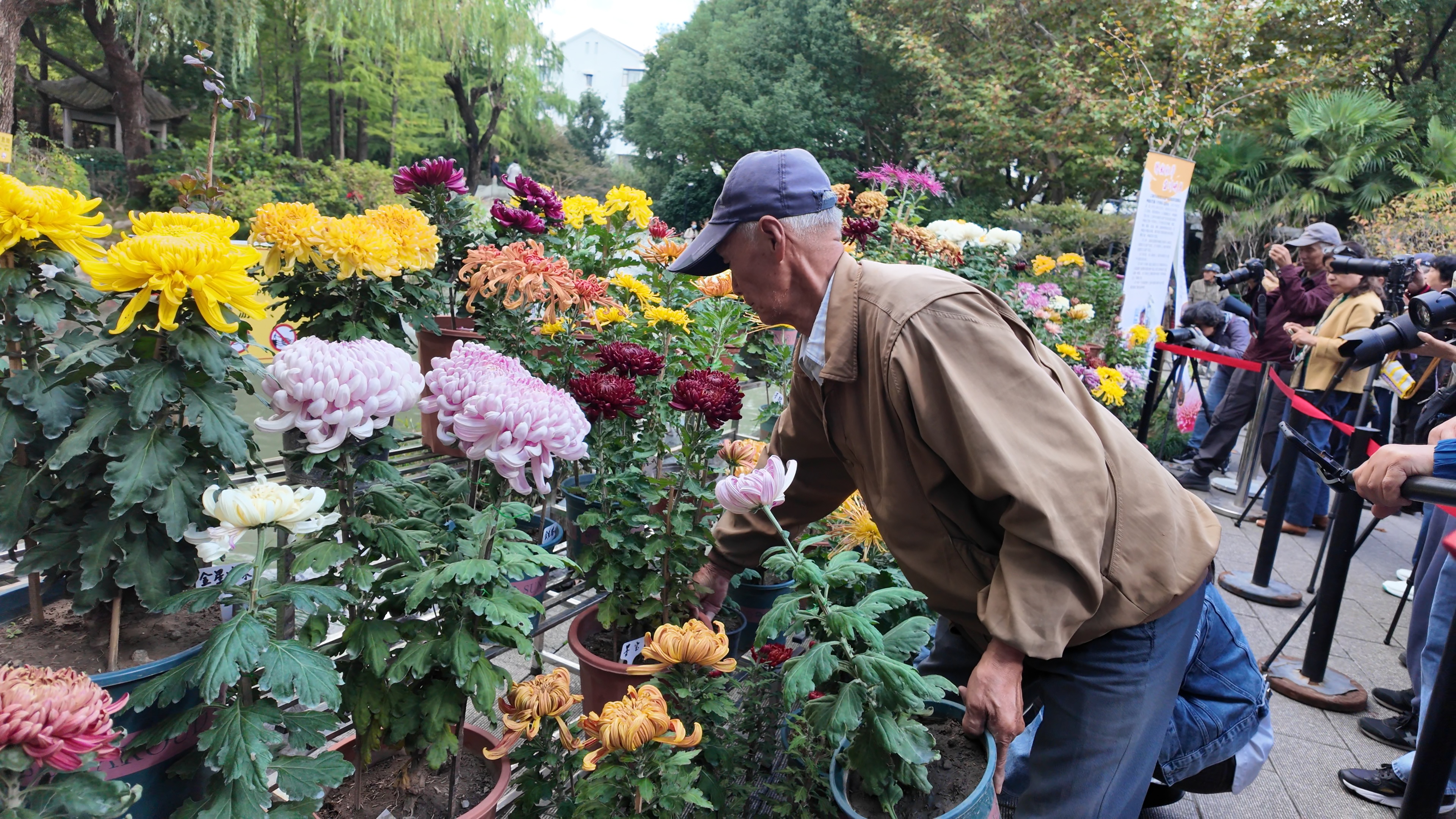家住附近的孔先生带着小孙子一起来逛公园,小孙子望着缤纷的菊花,用软糯的上海话连连称赞:“好看呀,好看!”孔先生也笑着附和:“宜川公园确实一年比一年好了。”