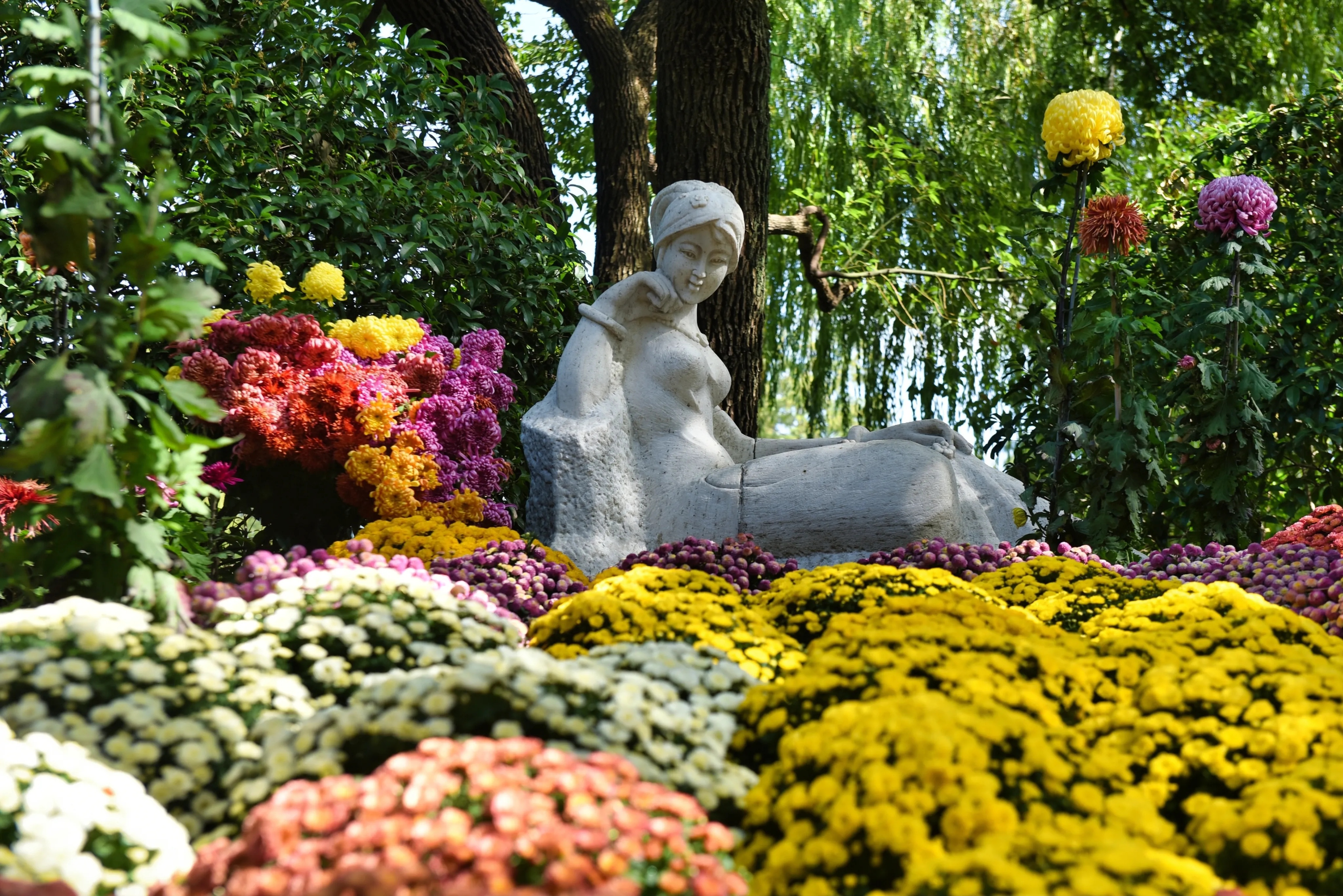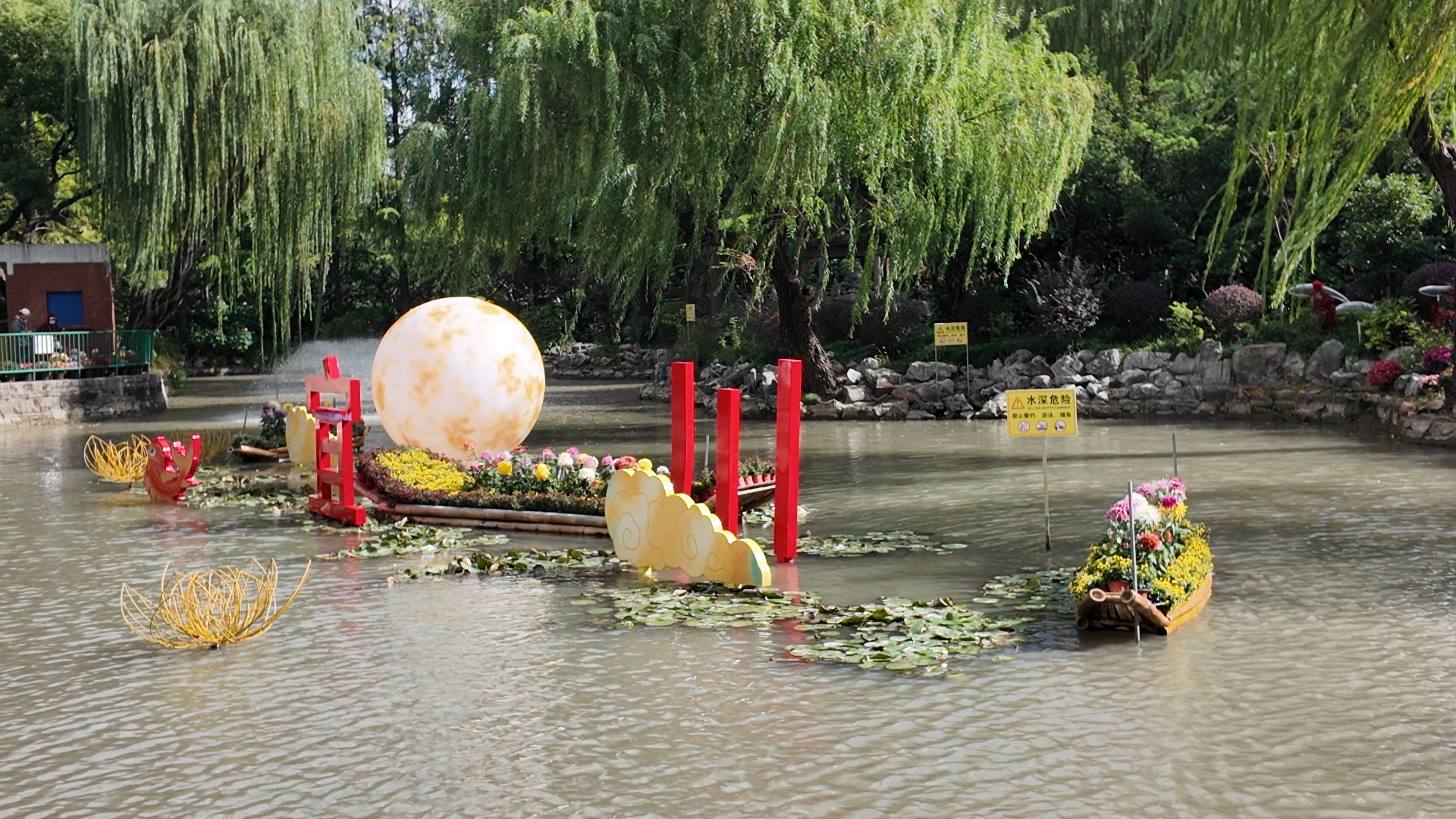 园内布置也颇具匠心。在出入口、河道周边、广场及道路两旁,随处可见塔菊、球菊、悬崖菊、菊花柱和造型孔雀菊等造型菊,方便游客驻足观赏拍照。沿河驳岸间隔布置悬崖菊,柔化了硬质驳岸的线条,并点缀各类大型造型菊,丰富了沿岸景观。道路两旁的绿化带内种植了品种菊,既增添了秋日色彩,也营造出浓厚的赏菊氛围,让游客在移步换景中感受菊花的多样美感。