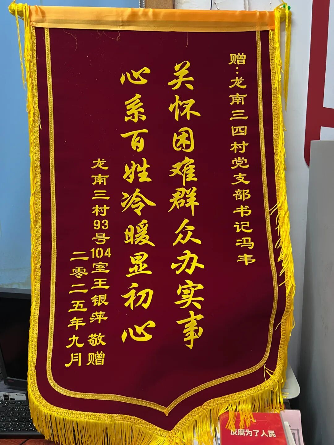 龙南三四村居委会工作人员还上门为王阿姨送上帮困物资。王阿姨特地为龙三四居委会送上了锦旗,上面写道“关怀困难群众办实事、心系百姓冷暖显初心”。