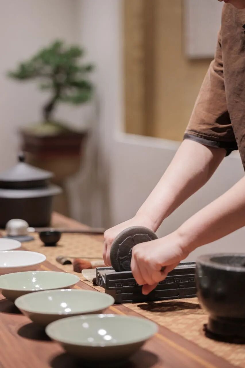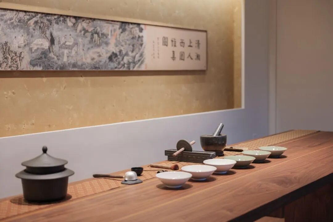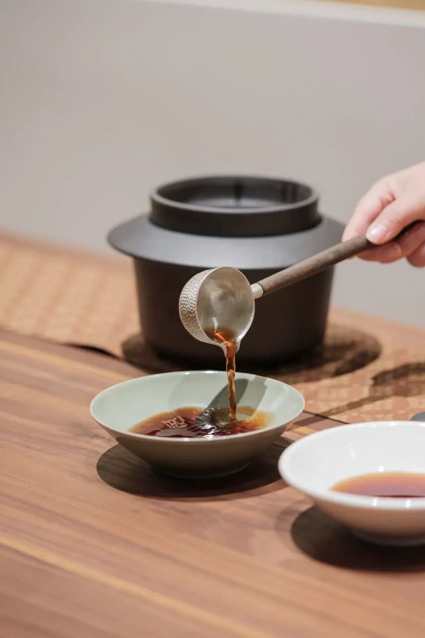 上博茶园沿用唐代煮茶器具,融入现代美学方式,精选茶碾、茶釜,并配以唐代南方的越窑青瓷碗和北方的邢窑白瓷碗,以三沸法复刻唐代煮茶之席。品饮一碗精心烹煮的普洱熟茶,其汤感醇厚绵长,带着时光沉淀的韵味,暖意由舌尖直达身心,让人瞬间梦回那个气象万千的黄金年代。