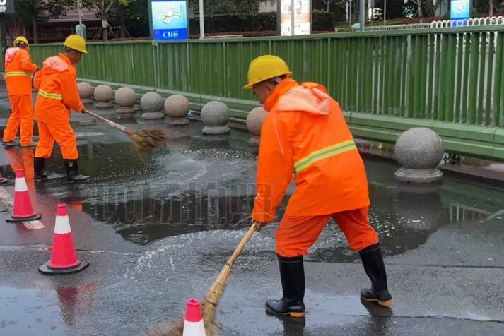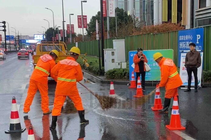 11月7日至8日,本市出现降雨天气,排水保障工作小组迅速响应,强化场馆周边诸光路、中国博览会会展综合体等重点区域的巡查频次与处置力度。现场保障人员及时开展地铁口、场馆出入口等点位的积水清扫和管道巡查工作,有效维护了展馆周边交通顺畅与市容环境整洁。