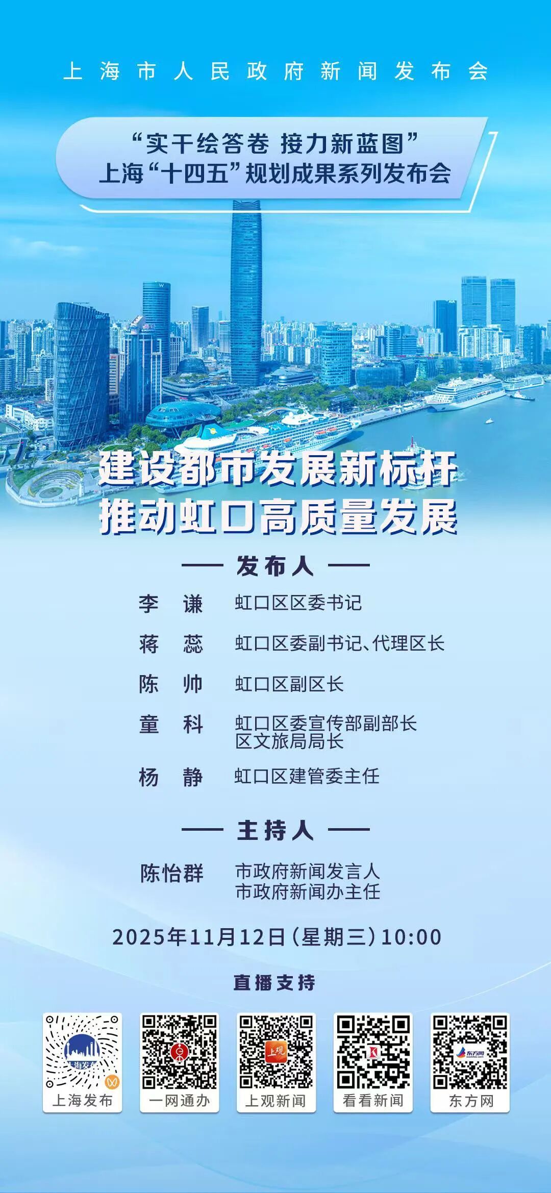 今天(11月12日)10:00—11:00,虹口区“建设都市发展新标杆、推动虹口高质量发展”主题新闻发布会将正式召开。
