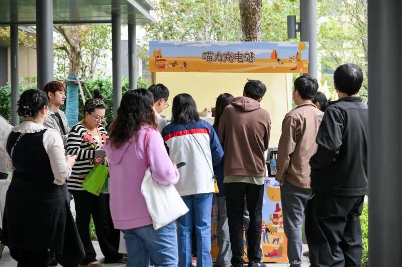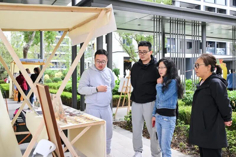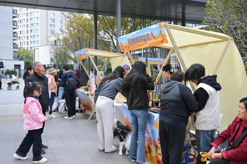 市集摊位更是亮点纷呈,逛到停不下来!非遗手工摊位上,居民亲手体验传统技艺,感受文化魅力;萌宠互动区里,“铲屎官”们带着毛孩子欢聚,邻里情谊在嬉戏中升温;大学生创业的迷你植物园,成为青年交流的自然小天地;AI体验区前,诗词生成、名片设计等趣味互动,让居民直观感受科技赋能智慧社区的无限可能。