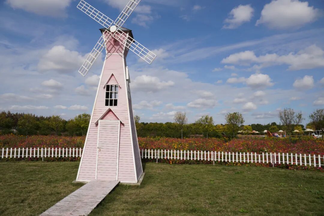 园方还别出心裁地设置了风车、木屋、连桥等景观小品。这些精致的小品与地肤相互映衬,为游客解锁多元的游览和拍照体验。