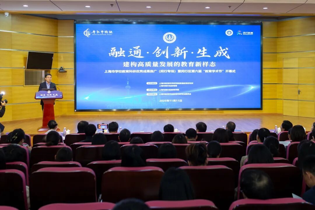 11月11日,以“融通·创新·生成:建构高质量发展的教育新样态”为主题的上海市学校教育科研优秀成果推广(闵行专场)暨闵行区第六届“教育学术节”开幕式举行。活动由上海市教育科学研究院普通教育研究所、上海市闵行区教育局主办,上海市教育学会教育科研专业委员会协办,上海市闵行区教育学院承办。 上海市教育委员会副主任杨振峰出席活动并讲话。上海市教育科学研究院党委书记祝郁为活动致辞,普教所党支部书记、所长徐士强为学校教育科研优秀成果案例作点评。 活动现场,闵行区委副书记唐劲松为闵行区教育局第十届学术委员会委员颁证。闵行区教育工作党委副书记、区教育局局长徐明怡介绍本届教育学术节方案。闵行区教育学院党总支书记潘蓓蕾作“从赋能走向生成:区域优秀教育科研成果培育的闵行实践”报告。 学术节开幕式由闵行区教育局副局长马秀明主持,市教科院普教所学校科研与发展中心主任冯明主持优秀成果分享环节。