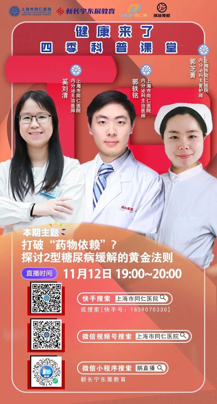 今天(11月12日)19:00—20:00,“上海长宁”App将与上海市同仁医院“大虹桥·同仁荟健康直播”共同直播:打破“药物依赖”?探索2型糖尿病缓解的黄金法则。