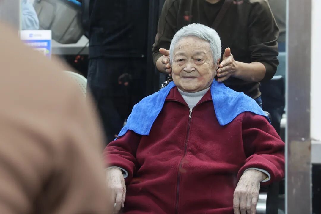 理发店工作人员为百岁老人理发化妆