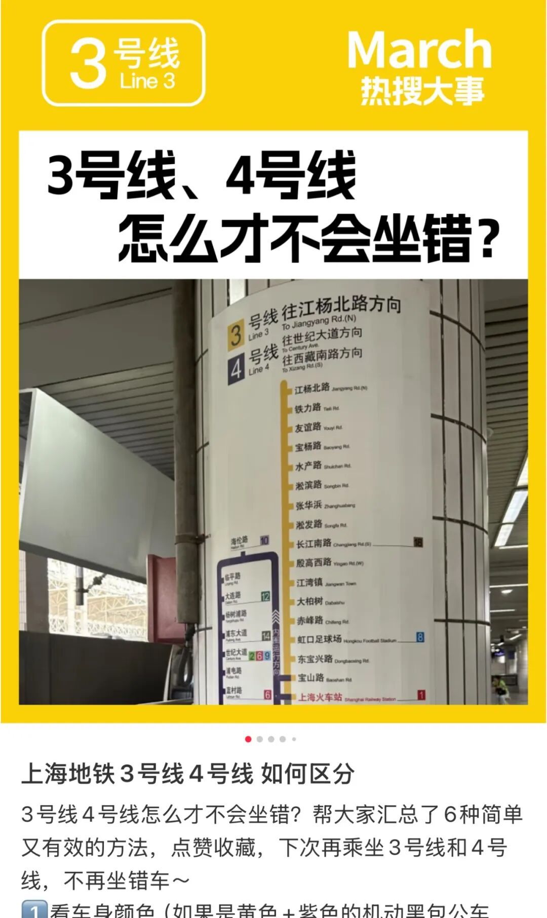 此前,由于3、4号线部分共线运营列车车身颜色一致,乘客难以通过车身贴纸快速辨识线路,导致误乘情况时有发生。为有效解决问题,上海地铁持续改进,明确标识升级优化方案,进一步提升乘客对3、4号线列车的辨识效率。