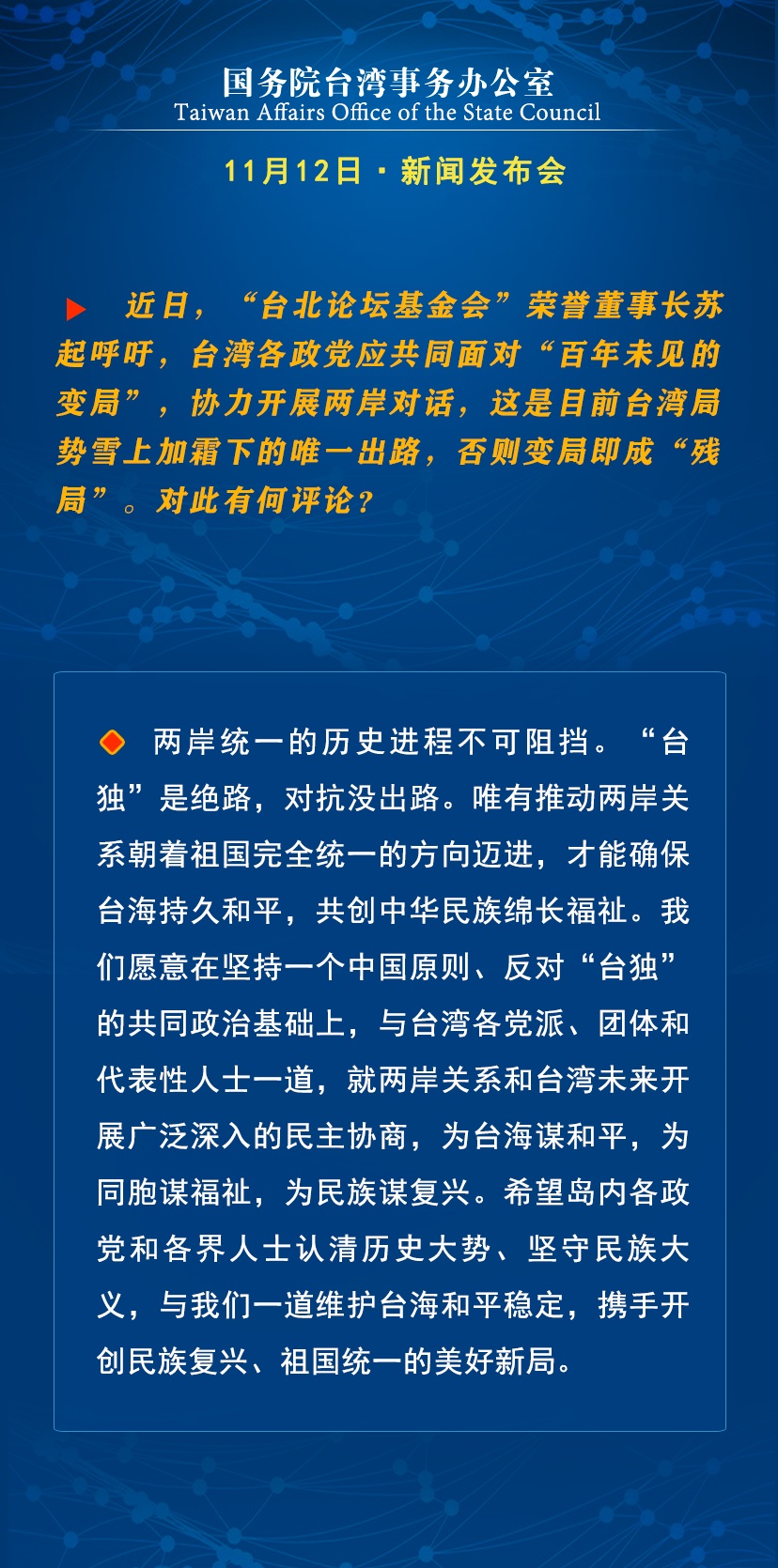 国台办:希望与岛内各政党各界携手开创祖国统一、民族复兴的美好新局