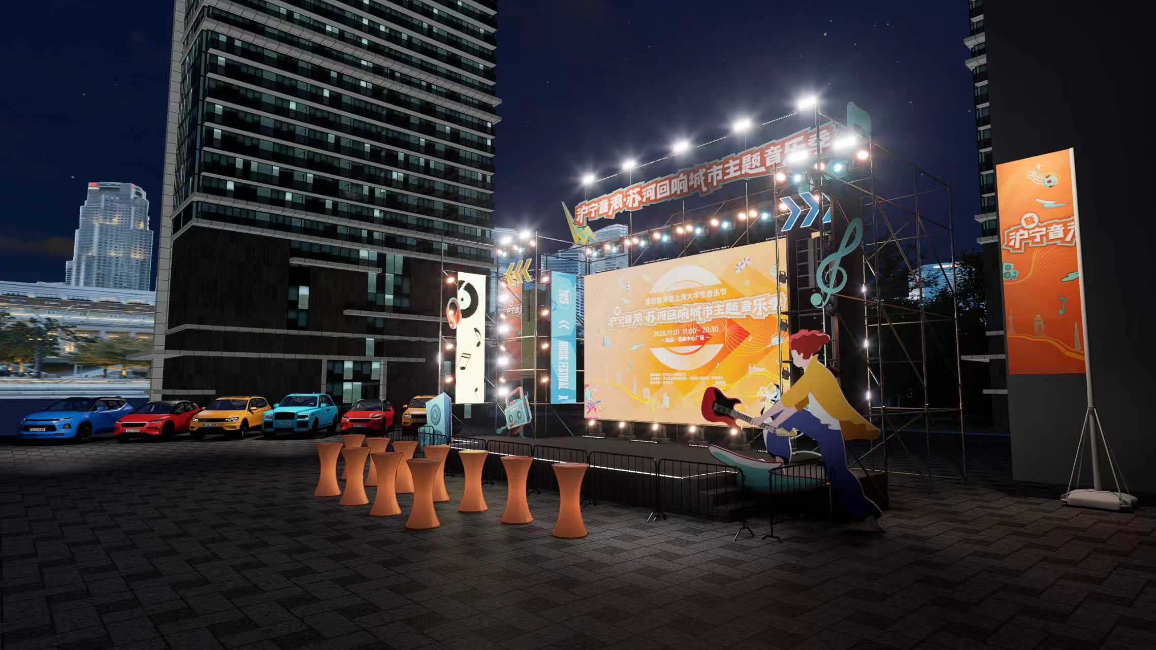 在会场布置方面,主办方巧思设计,将沪宁沿线独具特色的地域建筑融入会场布置。整体风格采用流线型设计来模拟高速路线与河流波纹,东方明珠、紫峰大厦、苏州园林等沿沪宁城市的地标剪影错落其中。色彩则以“金秋橙”为主色调,搭配霓虹蓝紫与苏河碧绿,突出青春与生态的交融。“音浪公路”主舞台也是一大亮点:舞台设计成沪宁高速抽象造型,灯光模拟车流光影,两侧设置高校校旗阵列。