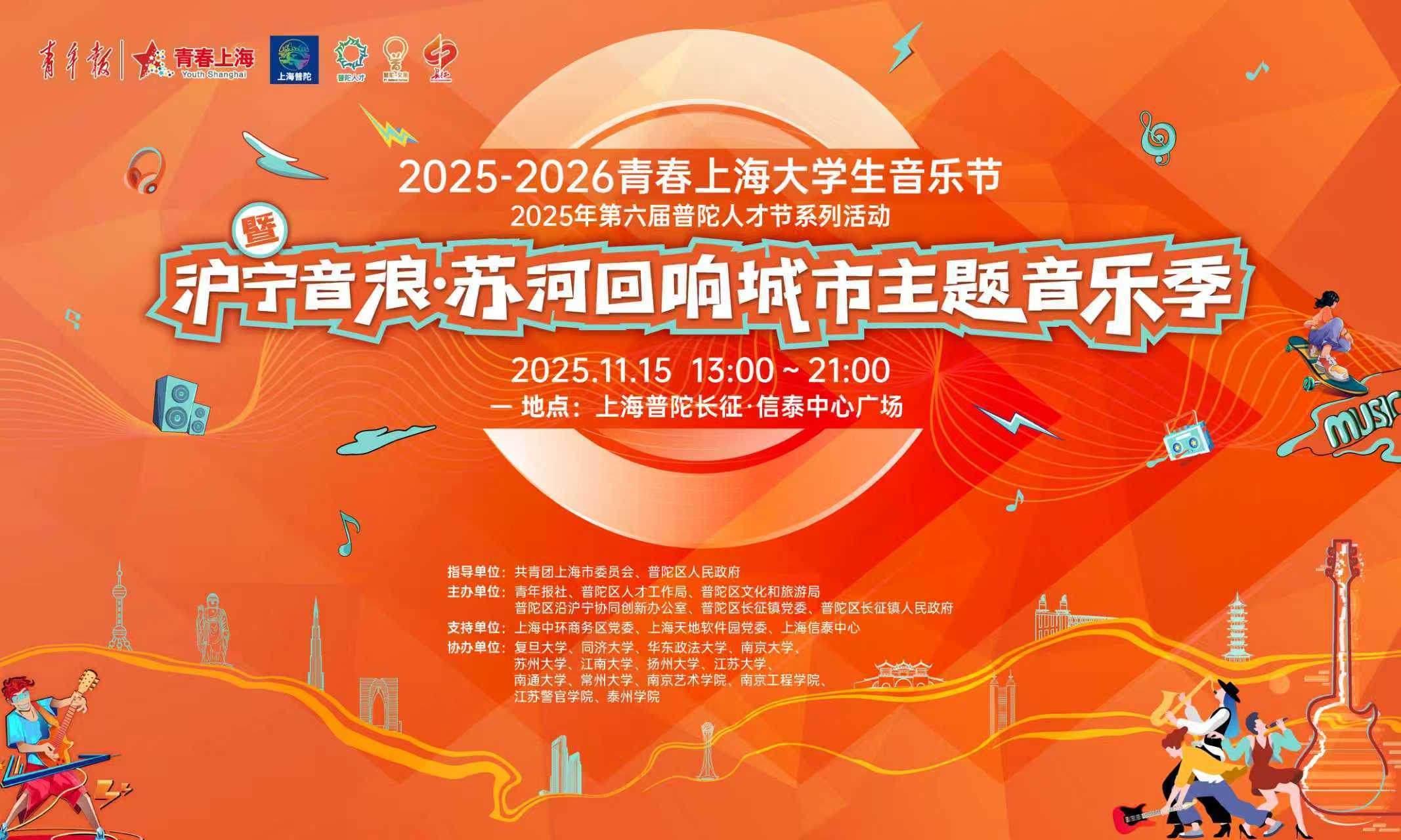 11月15日,2025-2026青春上海大学生音乐节暨沪宁音浪·苏河回响城市主题音乐季(普陀长征站)将在信泰中心广场举行。届时,复旦大学c57乐队、同济大学和谐常数乐队、南京艺术学院乐队、江南大学学生乐队、扬州大学乐队等校园明星乐队,与苏州大学、南通大学、泰州学院等沿沪宁八市的校园十大歌手将同台演艺,为观众呈现视听盛宴,集中展现沿沪宁高校学子的青春朝气与音乐才情。