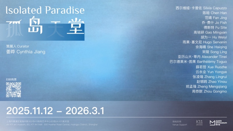 群展《孤岛天堂》(Isolated Paradise),由策展人姜晔策划,于11月12日开幕,持续至2026年3月1日。展览呈现十八位来自中国、欧洲及非洲等国家的艺术家最新创作。展览以绘画、纸本、水墨、雕塑、影像装置等多样媒介,探讨当代个体在高速流变与信息过载的时代中,如何于精神与现实之间,为自身保留一片“可栖居的岛屿”。