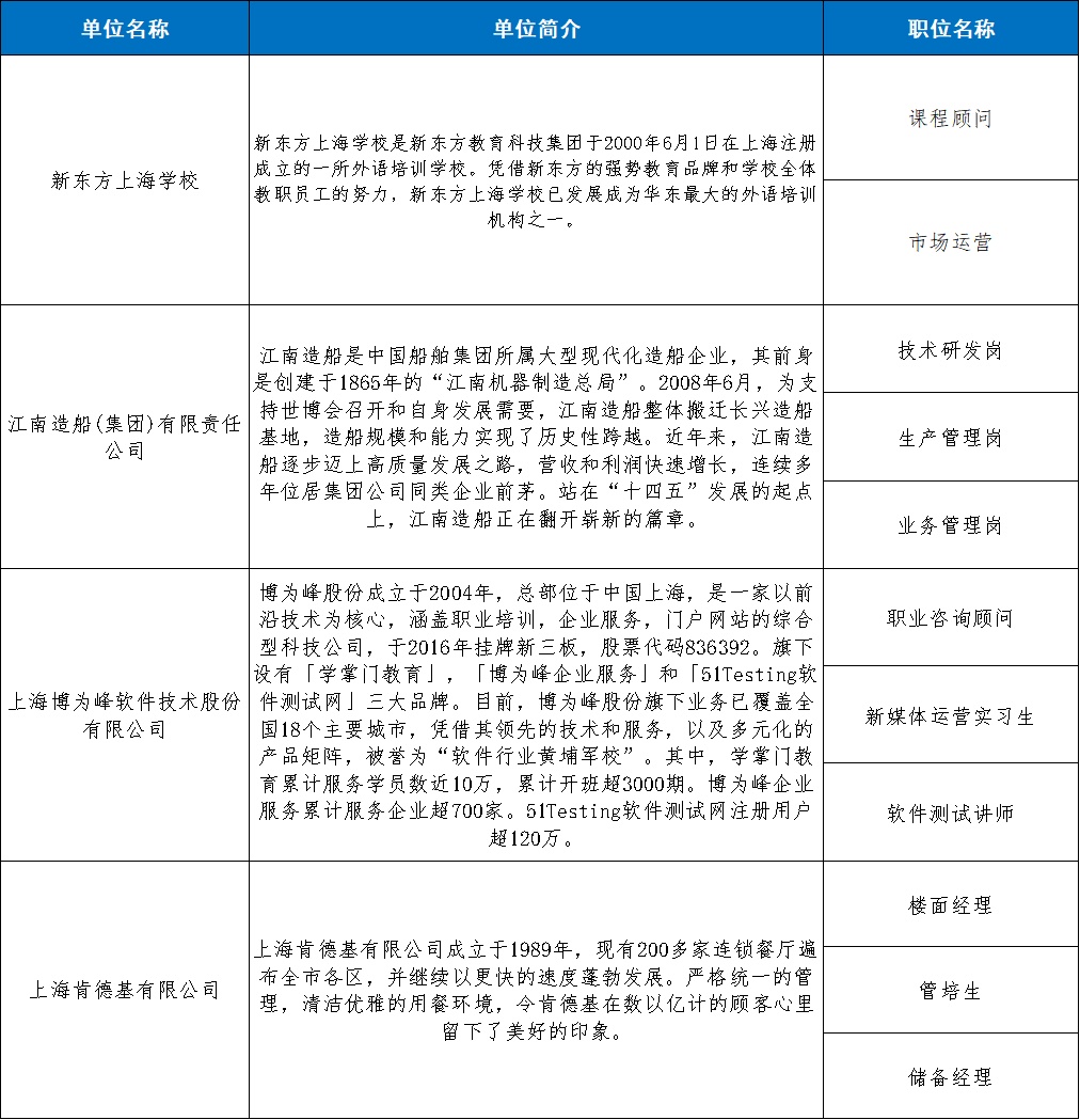 本次活动将为求职者呈上十余个不同类别的岗位,累计释放出百余个招聘名额。这些岗位分布广泛,全面涵盖了互联网、大制造、教育培训、专业服务等多个当下备受瞩目的热门行业,旨在全力以赴为毕业生在上海扎根发展提供坚实有力的支持。