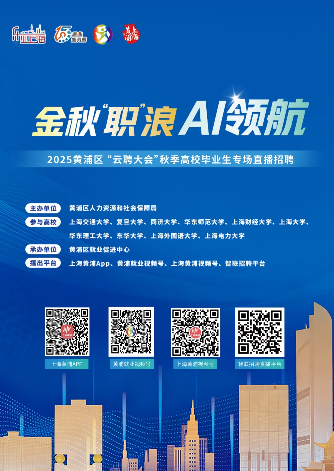 为进一步推动“稳就业、促发展”政策切实落地、发挥实效,全方位助力高校毕业生顺利开启职业生涯崭新篇章,黄浦区精心策划推出金秋“职”浪,AI领航——2025黄浦区“云聘大会”秋季高校毕业生专场直播招聘活动。值得一提的是,此次活动将首次采用AI直播形式,于11月14日14:00在云端开启!