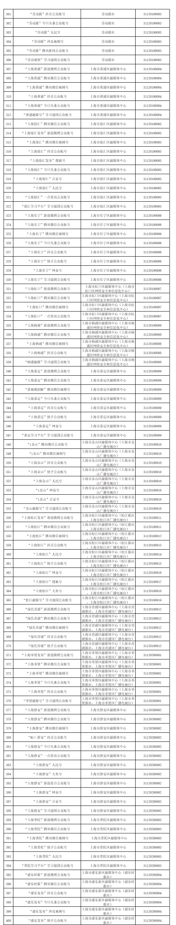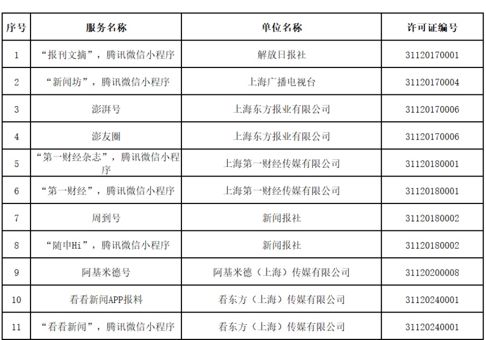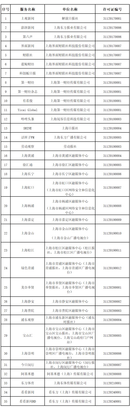 截至2025年9月30日,由上海市互联网信息办公室批准的互联网新闻信息服务单位共36家,分别是:解放日报社、文汇报社、新民晚报社、上海广播电视台、上海东方网股份有限公司、上海东方报业有限公司、上海界面财联社科技股份有限公司、上海第一财经传媒有限公司、新闻报社、上海阅客信息科技有限公司、上海日报社、上海东方广播有限公司、青年报社、上海法治报社、劳动报社、上海市黄浦区融媒体中心、上海市徐汇区融媒体中心、上海市长宁区融媒体中心、上海市虹口区融媒体中心(上海市虹口区网络安全和信息化中心)、上海市杨浦区融媒体中心(上海市杨浦区网络安全和信息化中心)、上海市嘉定区融媒体中心、上海市金山区融媒体中心(上海市金山广播电视台)、上海市松江区融媒体中心(松江报社、上海市松江区广播电视台)、上海市青浦区融媒体中心(上海市青浦报社、上海市青浦区广播电视台)、上海市奉贤区融媒体中心(上海市奉贤报社、上海市奉贤区广播电视台)、上海市静安区融媒体中心、上海市普陀区融媒体中心、上海市浦东新区融媒体中心(浦东时报社)、上海市宝山区融媒体中心(上海市宝山区宝山报社、上海市宝山区广播电视台、上海宝山政府门户网站)、上海市崇明区融媒体中心(上海市崇明区广播电视台、上海市崇明报社)、上海市闵行区融媒体中心(闵行报社、上海闵行广播电视台)、阿基米德(上海)传媒有限公司、上海东体传媒有限公司、五星体育传媒有限公司、上海科技报社、看东方(上海)传媒有限公司。