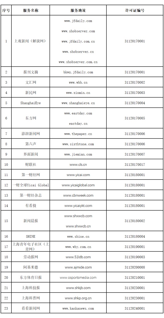 另,上海属地内的上海观察者信息技术有限公司、上海基分文化传播有限公司、上海大智慧信息科技有限公司、上海喜马拉雅科技有限公司由国家互联网信息办公室颁发《互联网新闻信息服务许可证》,准许其从事互联网新闻信息转载、传播平台服务。上海热线信息网络有限公司由国家互联网信息办公室颁发《互联网新闻信息服务许可证》,准许其从事互联网新闻信息转载服务。
