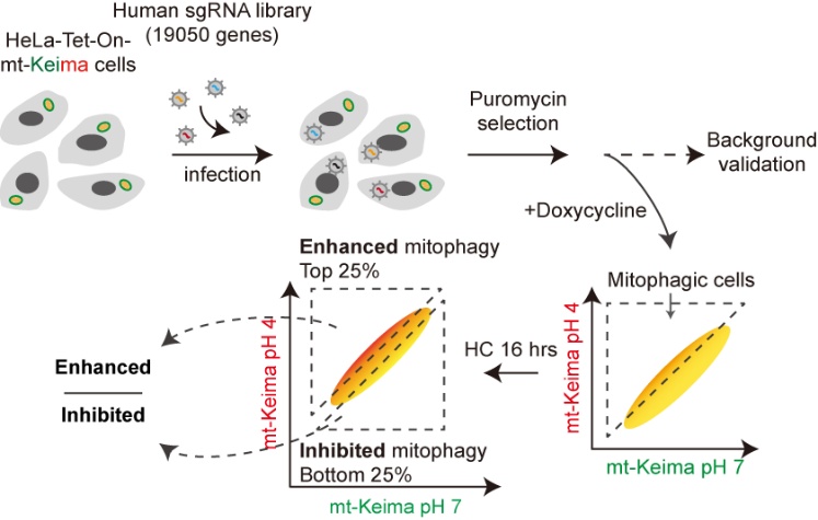 将全基因组CRISPR文库慢病毒感染稳定表达多西环素诱导型mt-Keima报告基因的HeLa细胞,经过嘌呤霉素筛选扩增,经多西环素诱导mt-Keima表达后用HC处理诱导线粒体自噬。最终,通过流式细胞术分选细胞并进行测序分析。