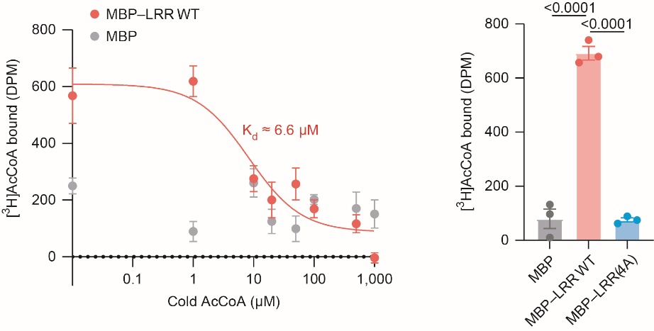 将纯化的重组MBP-LRR WT、MBP-LRR(4A)或MBP蛋白与 2 µM3H标记的乙酰辅酶 A共孵育,通过闪烁计数器检测3H标记的乙酰辅酶 A结合情况。