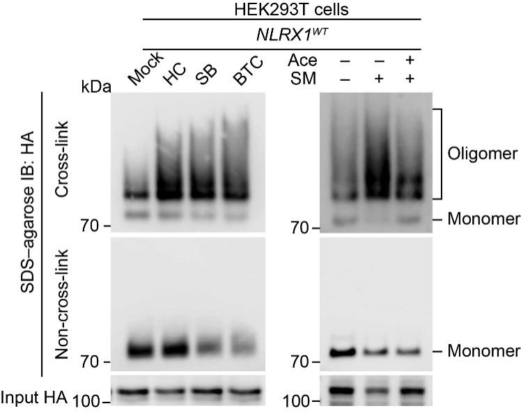 表达NLRX1 WT(野生型)的HEK293T细胞经指定条件处理后,将样品分为两份,一份使用戊二醛交联,另一份不交联,随后使用SDS-agarose电泳检测NLRX1的寡聚化水平。