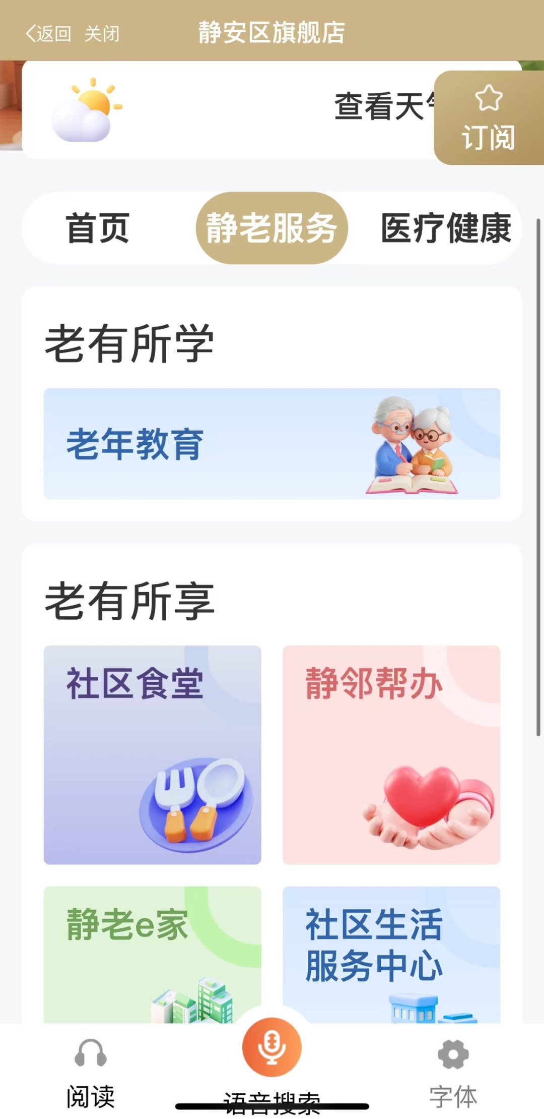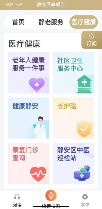 进入对应页面,可快速选择“静老服务”、“医疗健康”两大主题内各种常用服务,不同色块搭配超大字体,方便老年群体浏览及使用。