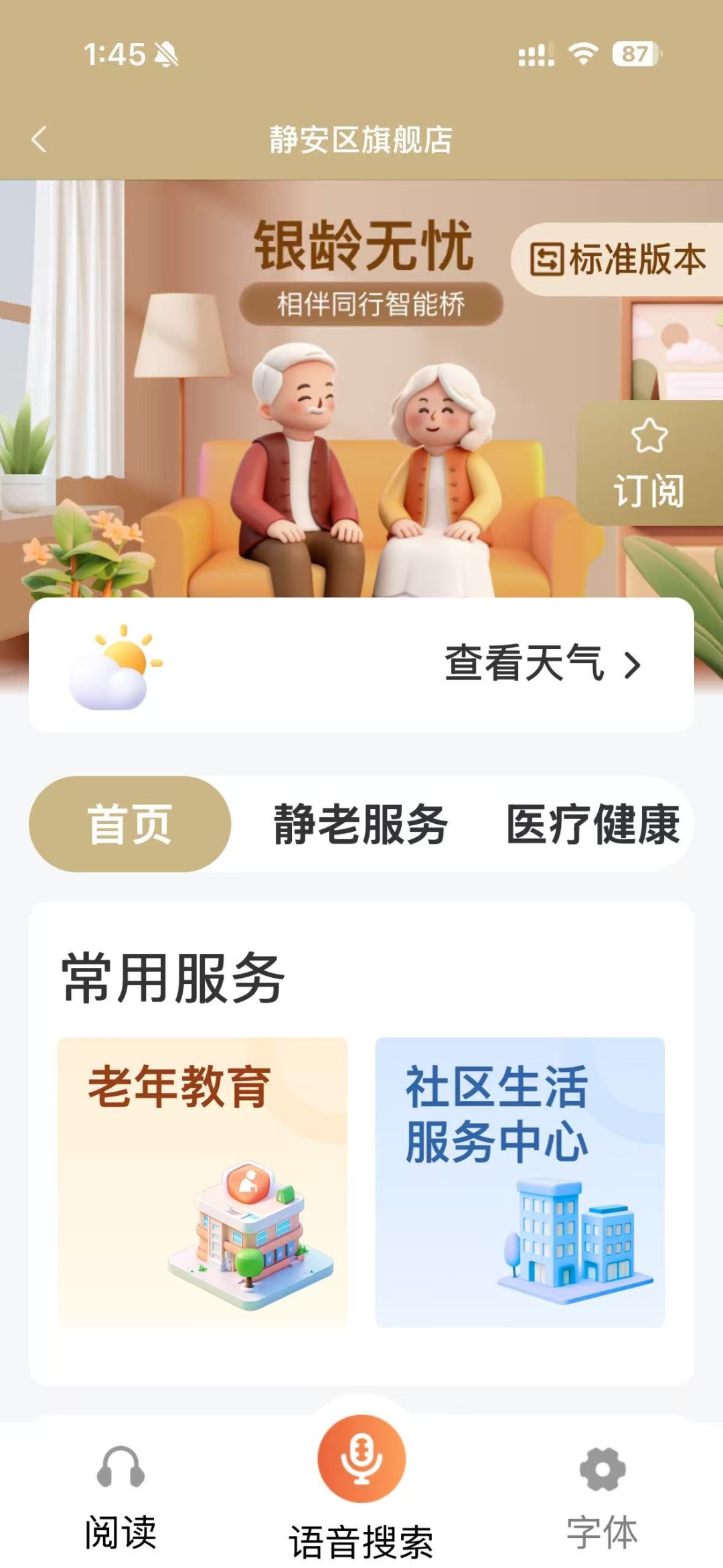 为了更好的帮助老年群体跨越“数字鸿沟”,便捷享受更多社会服务,“随申办”静安旗舰店针对老年人常用服务优化了“养老专版”,此次改版我们为老年人精心打造大字体、高对比度界面设计,并配备阅读播报、语音搜索、一键放大等辅助功能,切实解决了老年人“看不清”“不会用”“找不到”的难题,为老年人提供暖心服务,随“申”相伴。